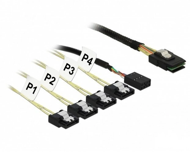 - Delock kábel (83319) Mini SAS SFF-8087 | 4 x 7 tűs SATA fordított + oldalsáv, 1m | 83319
